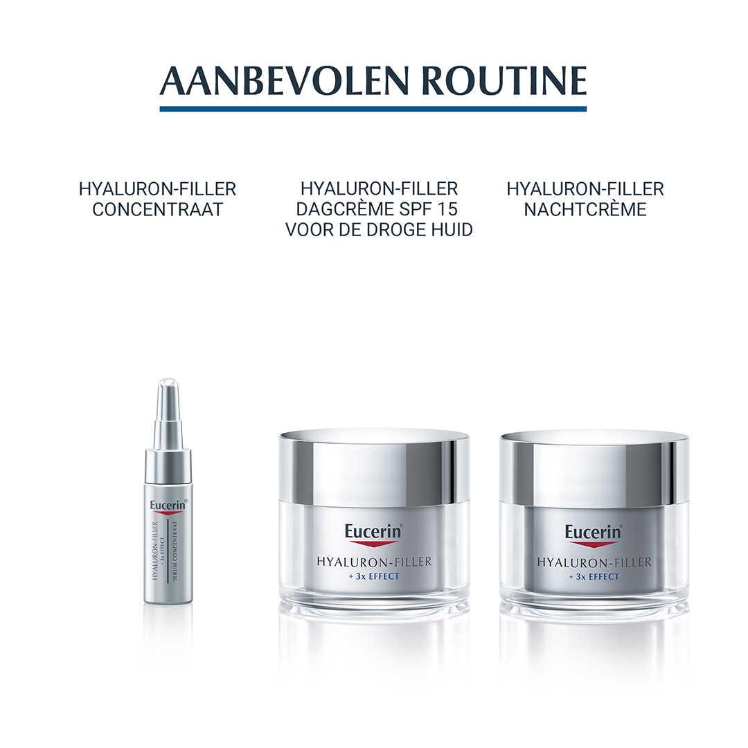 Naarmate de huid ouder wordt, neemt de huideigen productie van Hyaluronzuur af, waardoor rimpels ontstaan en de huid er ouder uitziet. Eucerin Hyaluron-Filler Oogcontourcrème SPF 15 met 3x EFFECT gaat dit proces tegen: 1. Vult: Hoog & laag moleculair Hyaluronzuur hydrateert en vult rimpels. 2. Stimuleert: De anti-oxidant Saponine activeert de huideigen Hyaluronzuurproductie en beschermt de huid tegen vrije radicalen. 3. Beschermt: Enoxolone vermindert de afbraaksnelheid van Hyaluronzuur.